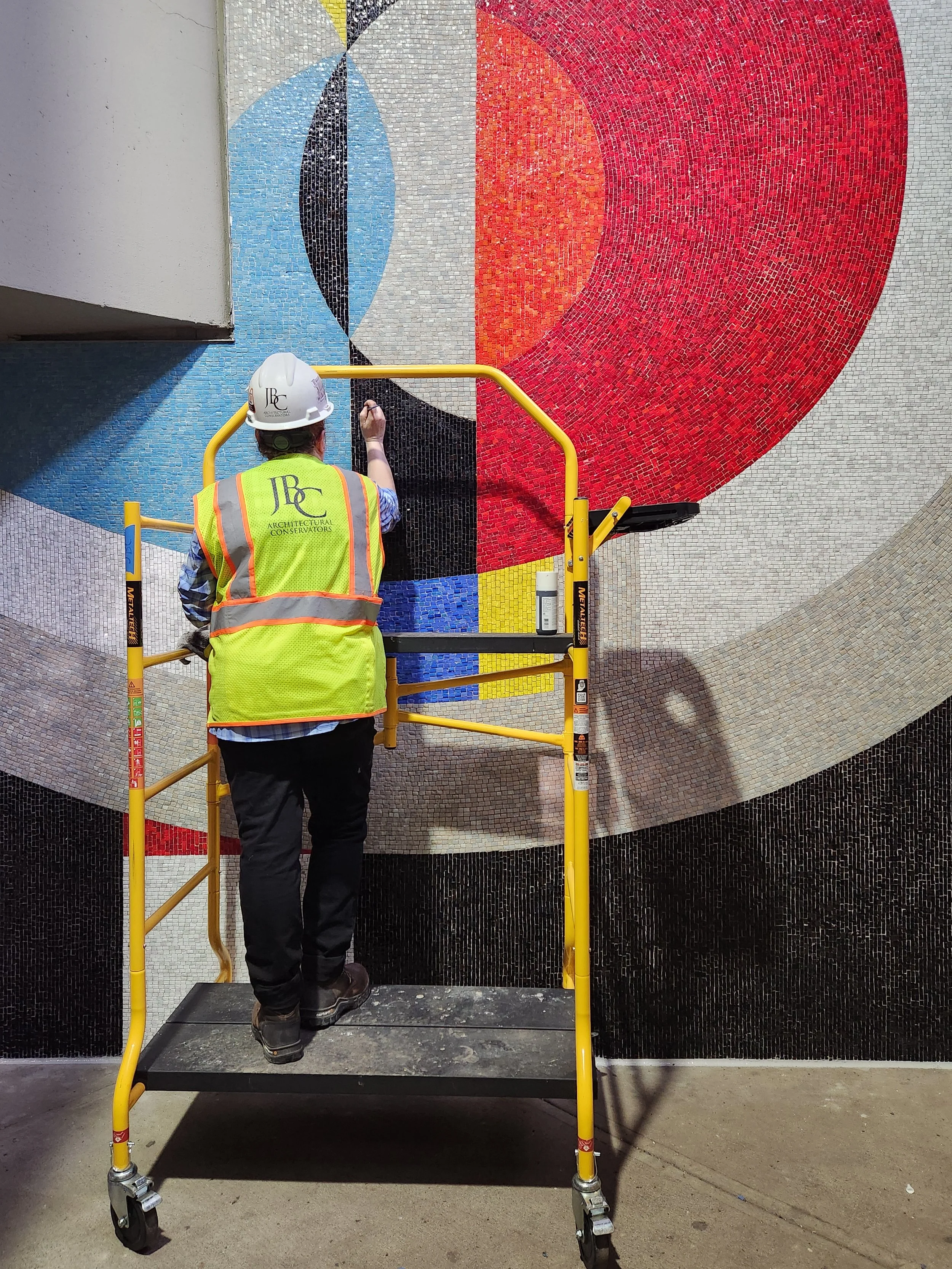 A conservator in-paints terra cotta mural panels removed for relocation.